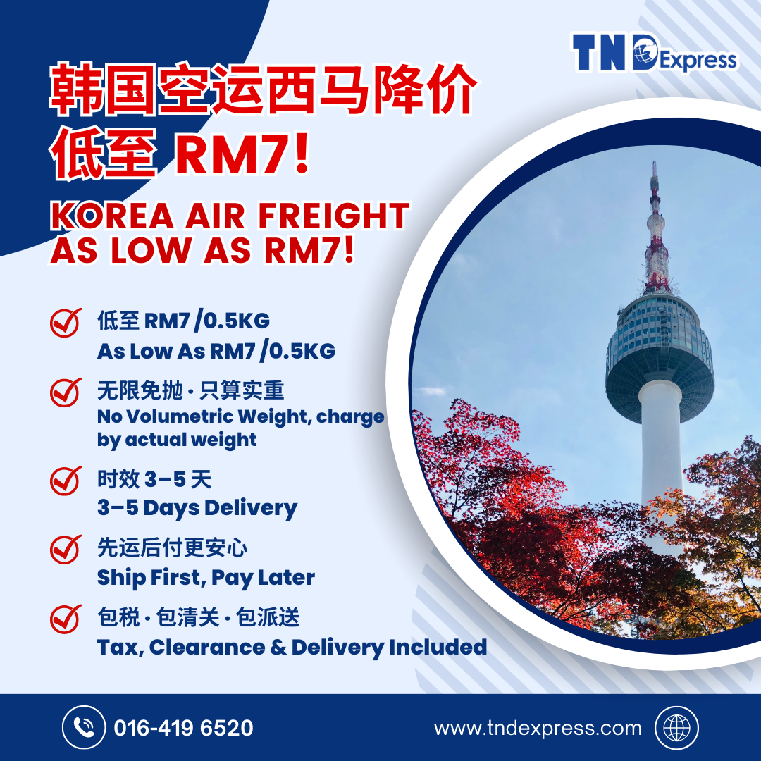 目前我司已经下调韩国空运西马价格啦!最新价格低至RM7同时也实现无限的免抛!只计算实际重量啦!韩国西马空运 - 价格如下1-2 首1KG RM20, 续重RM9/0.5KG2.5-30KG RM8.50/0.5KG30KG以上 RM7/0.5KG时效3-5天包税,包清关,包派送到门先运后付- 货物保障安全抵达入境才收运费!韩国空运最新价格表感谢您的支持!TND EXPRESS
